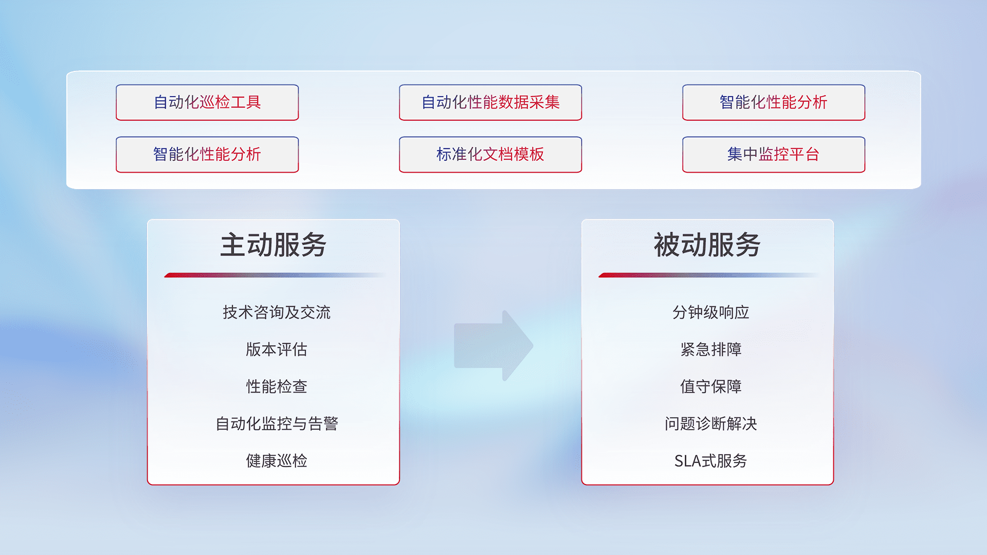 智能化工具和标准化文档,,,,保障服务质量,,,,提供主动服务(包含技术咨询、、、、版本评估、、、、性能检查、、、自动化监控与告警、、健康巡检)和被动服务包含(分钟级响应、、、紧急排障、、、、值守保障、、、问题诊断解决、、、、SLA服务)。。。