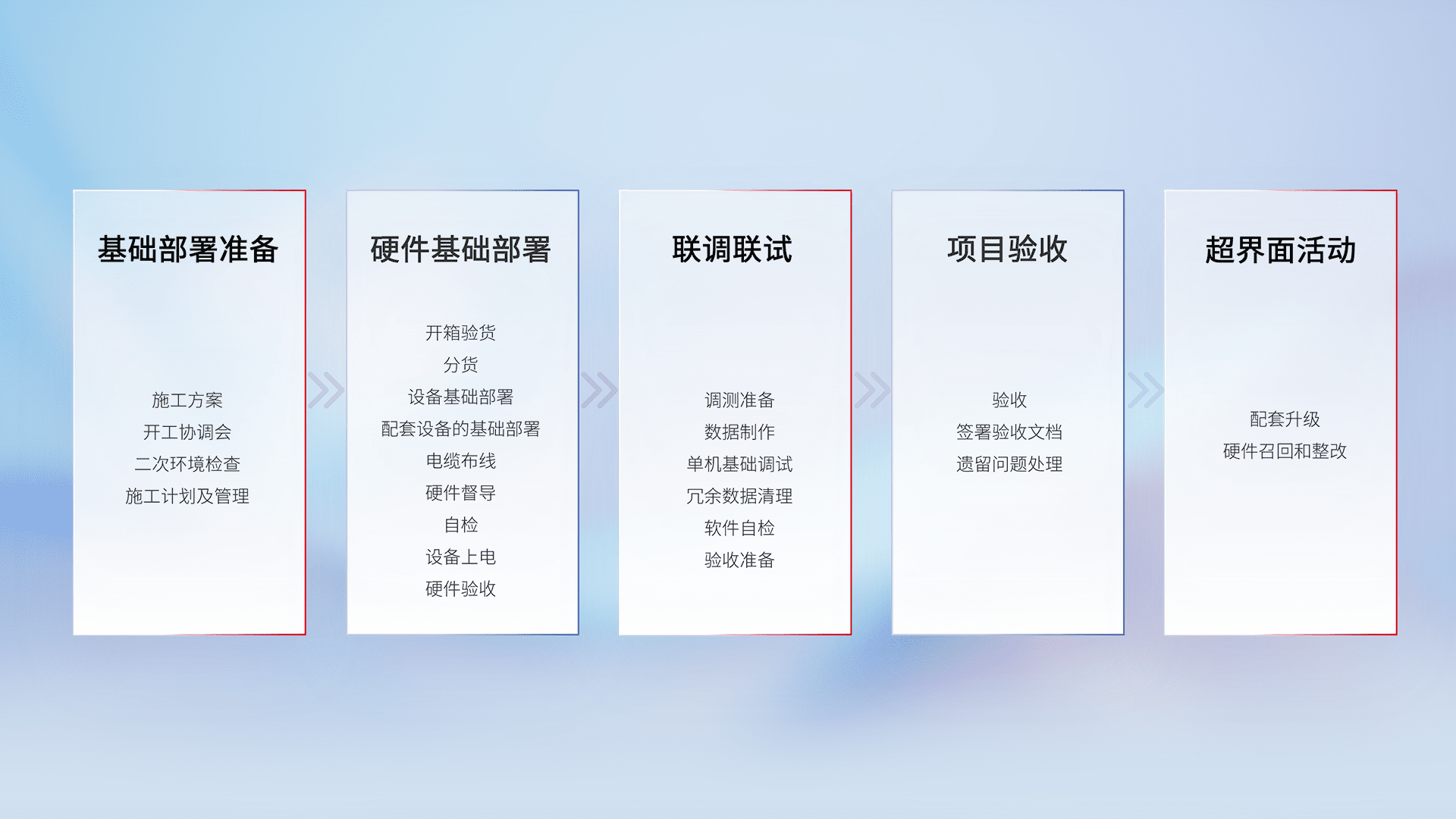 从基础部署准备、、硬件基础部署、、、联调联试、、项目验收、、越界面活动的全过程可追溯,,,保证施工质量和进度。。。